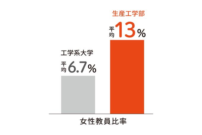 工学系大学の女性教員比率の全国平均平均6.7%(R4調査)に対して、R7年の生産工学部は13.2%と約2倍!