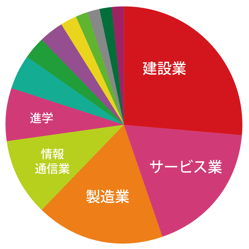 建設会社(ゼネコン、建設コンサルタント等)、メンテナンス関連の企業をはじめ、化学メーカー、食品関連、IT、また国家・地方公務員や教員等、幅広い分野で活躍しています。